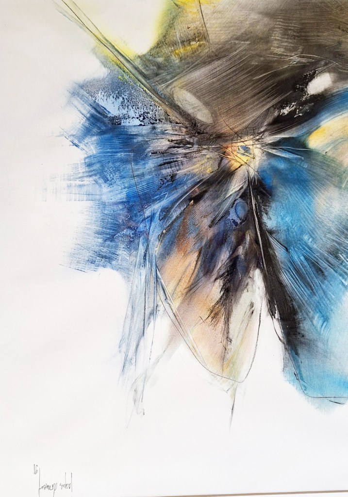 De Leningrad à Saint Pétersbourg, du temps de ma grand’mère à celui des particules corrélées, et puis à Grand Caïman -qui est une île des Caraïbes, par le travers de nos folies, de Sainte Catherine à Toronto (à moins qu’à Montréal?), j’ai vu, j’ai cherché, j’ai senti et aimé, et toujours tant reçu, qu’aujourd’hui devant la toile blanche les acquits sont ma dette comme un bonheur étalé, par où je plonge, j’explose, ou je m’envole pour rejoindre ces rêves d’adolescent lovés d’un temps suspendu, quand j’explorais l’Univers dans la nostalgie déjà de futurs inconnus.